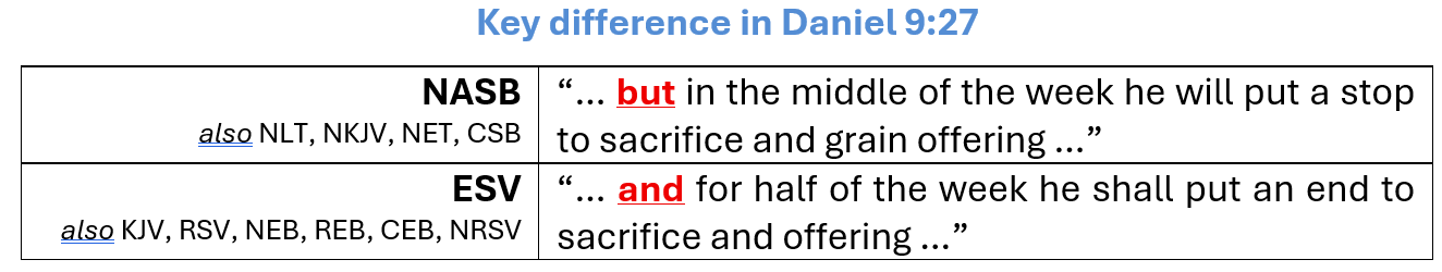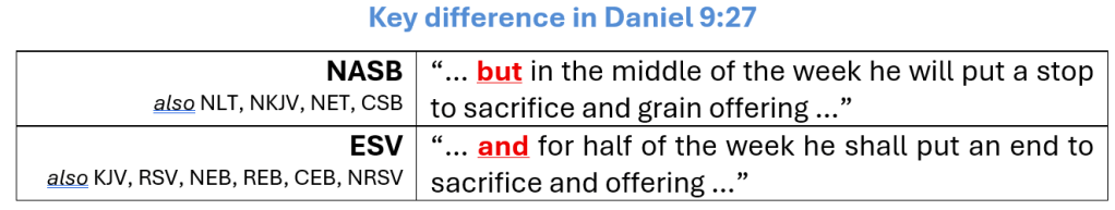 The two emphases are very different. The NASB (et al) sees this leader take a dark turn sometime after he confirms the covenant. The ESV (et al) just sees another event following it. There is no “right way” to render the conjunction—context must decide. But, it’s enough for you to know that many solid bible translations understand Daniel 9:27 to be describing something very bad.