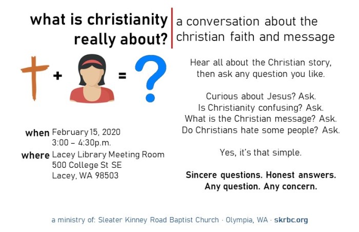 1. Thanks for the encouragement! We’re scheduling our next one for probably mid-April. We may do more themed events in the future, also, like “What do Christians Really Think About Homosexuality?” or similar controversial topics.