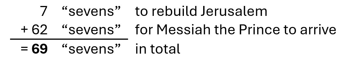- Option 1 suggests (a) Messiah’s arrival = seven “sevens,” and (b) Jerusalem’s re-building = 62 “sevens”—a total of 69 “sevens” (ESV; also RSV, NEB, REB, CEB, NRSV).