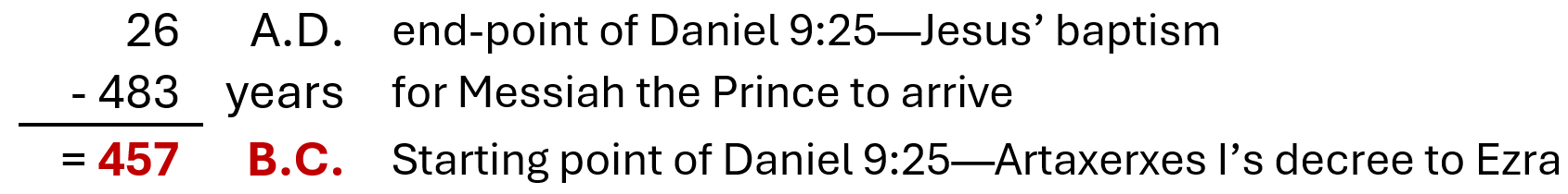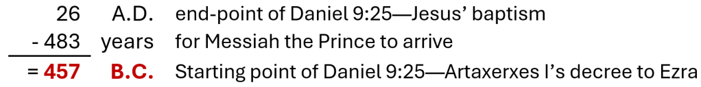 Returning to our options for dating—the only reasonable solution, if we take each “seven” to be a unit of seven years each, is to see the beginning point of the timespan from Daniel 9:25 as Artaxerxes I’s decree for Ezra to head to Jerusalem in ≈ 457 B.C. It shakes out like this:
