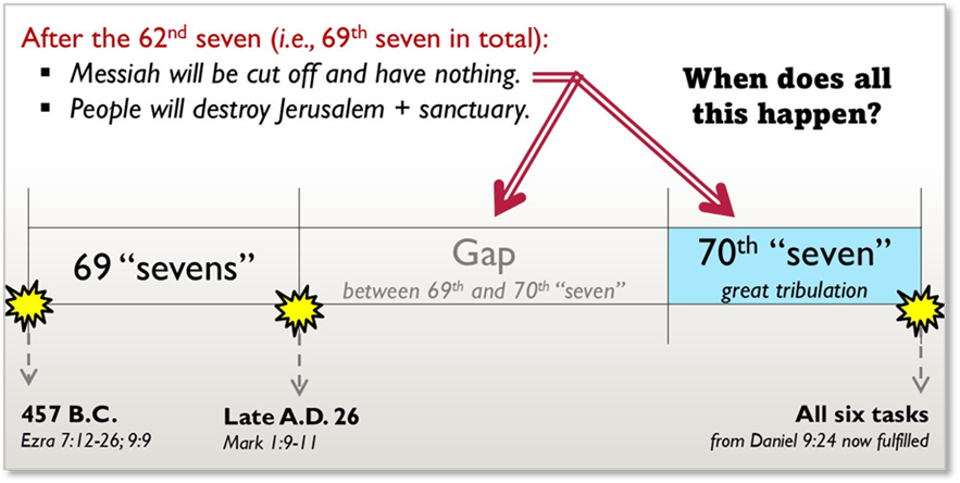 - This would mean all six tasks in Daniel 9:24 (“Seventy weeks have been decreed for your people and your holy city …”) must take place within seven years of Messiah being “cut off” (A.D. 37-ish)—which must be the case if the 70th “seven” truly followed right on the heels of the 69th.
