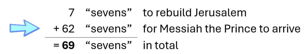 - This shakes out with (a) Jerusalem being rebuilt, and then (b) Messiah the prince arriving on the scene (Dan 9:25). This will take 69 “sevens” to happen, but it’ll happen.