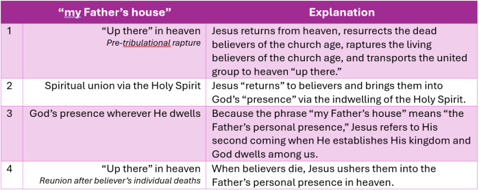 It seems there are four possible options for understanding John 14:2-3, and they each rely on different definitions of “my Father’s house.”