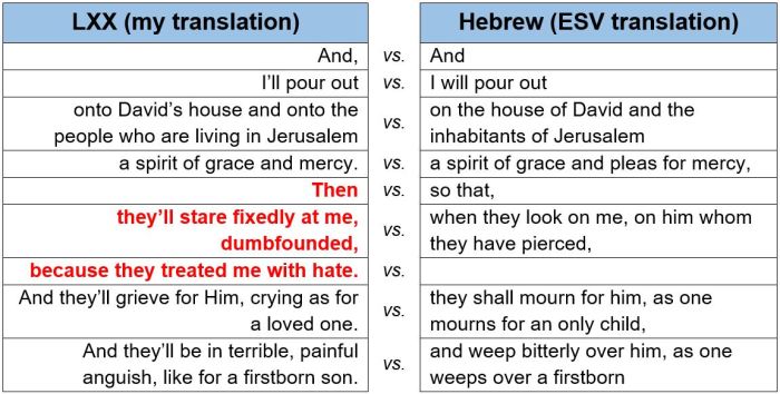 The “look upon” part is still there; I just translated it in a more colloquial fashion (“stare fixedly at me, dumbfounded”). It’s the second part that’s different. The LXX says the Israelites will be astonished because they treated Yahweh with so much hate. How did they do this? Well, presumably, they treated Him with hate (or, despitefully) by rejecting Him for so long … until they didn’t.
